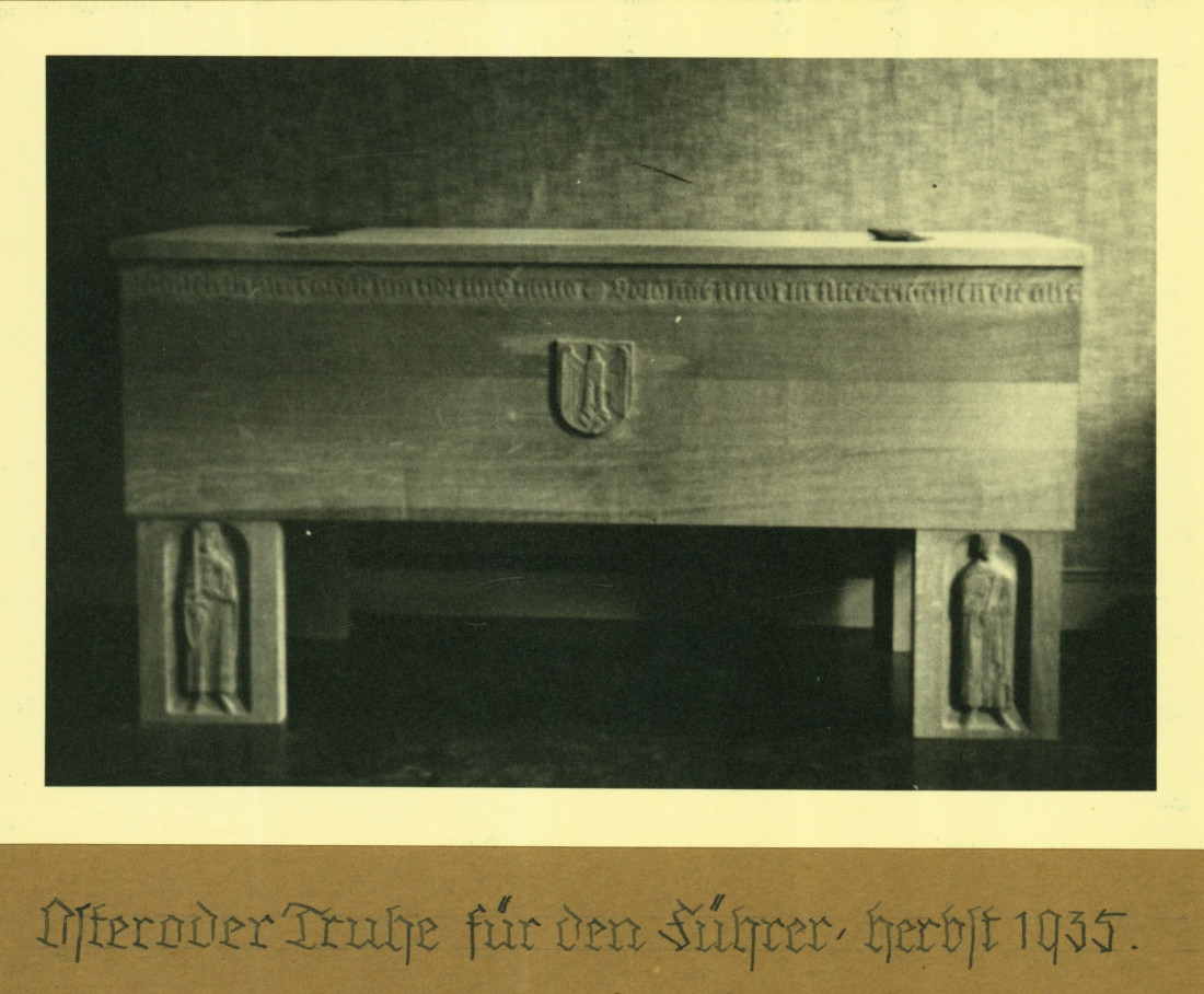 Zwar hat die Recherche noch keine Abbildung der für Hitler bestimmten Truhe ergeben, aber die vom Bürgermeister von Osterode für diese Truhe ausgestellte Urkunde ist in einem Katalog zur Osteroder Truhe publiziert worden.